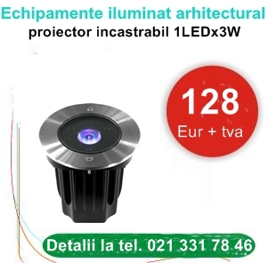 Music&Lights ARCGROUND3TRI proiector lumini arhitecturale incastrabil in paviment, 1 led x 3 W, IP 66, Tri color, 230 V ca; pret proiector lumina 128 Euro+tva. Aplicatii: iluminat architectural exterior cu lumini multicolore, proiectorul asigura mix peste 16 milioane nuante.Contact Axial Acustic,importator iluminat LED, 021-331.78.46, 0749-190.532, comenzi@axialacustic.ro, www.axialacustic.ro