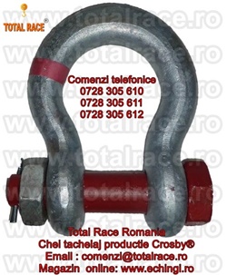 Total Race comercializeaza : chei tachelaj forjate Omega G2130 Crosby® , cheie tachelaj cu bolt, piulita si stift de blocare , chei tachelaj capacitate intre 0,33 Tone si 150 Tone . Cheile de tachelaj sunt in conformitate cu: EN 13889:2003 si indeplinesc cerintele de performanta ale Fed. Spec. RR-C271D tip IVA, grad A, Clasa 2. Chei de tachelaj cu factor de siguranta: MBL = 6 x WLL (Sarcina maxima de lucru) , cheie tachelaj: Forjat-Calit si Temperat,material otel aliat, galvanizata la cald. Capacitatea stantata permanent pe shackles. Cheile de tachelaj peste capacitate WLL= 25 tone sunt echipate RFID. Cheile de tachelaj Crosby® se livreaza cu certificate de calitate CE de la producator.