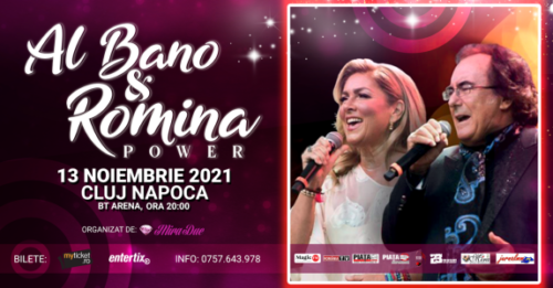 Concert Albano & Romina Power- 13 Noiembrie 2021 Cluj-Napoca- BT Arena- Cuplul italian cel mai iubit de publicul internațional “Al Bano&Romina Power” își reia “LIVE TOUR 2021”, întrerupt în 2020. O ocazie specială de a putea asculta noul album și toate cele mai mari succese internaționale ale Al Bano&Romina Power. Biletele puse în vânzare pe circuitele online: myticket.ro – entertix.ro (organizator MiraDue) info: 0757643978