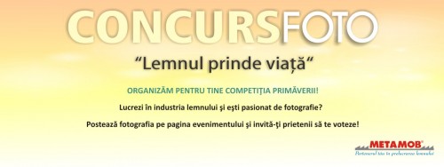 Organizam un super concurs foto pentru cei care lucreaza in industria lemnului. Arata-ne ce inseamna pentru tine sloganul “Lemnul Prinde Viata” si ia-ne premiile in valoare de 1500 RON. Detalii pe pagina de Facebook a Metamob (https://www.facebook.com/events/1632236550341129/) Perioada concursului: 26 martie-15 aprilie