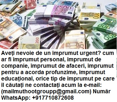 Cauti ajutor financiar ?????? pentru afaceri / personale sau în orice scop, apoi trimiteți-ne prin e-mail acum pentru a obține aprobarea rapidă, cu rate mici de dobândă, contactați-ne prin e-mail