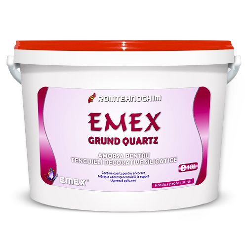 Grundul Silicatic de Amorsare cu Cuart pentru Tencuieli EMEX este un produs profesional, hidrosolubil,de silicat de potasiu, pigmenti, fileri, aditivi specifici si cuart, pentru pregatirea superioara a suprafetelor exterioare, in vederea acoperirii acestora cu tencuieli decorative structurate silicatice. Cuartul existent in produs creaza puncte de ancora la nivelul suprafatei, determinand o maxima aderenta a stratului de tencuiala la suport. Produsul are o rezistenta deosebita si proprietati de protectie impotriva fungilor, bacteriilor si mucegaiurilor.
