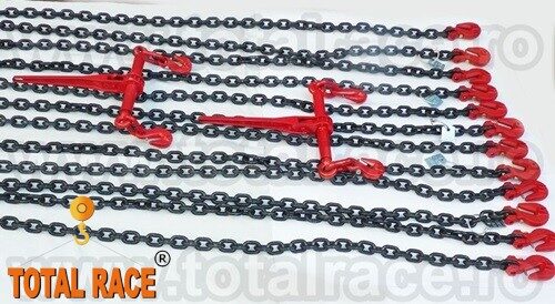 Total Race Group comercializeaza din stoc lanturi ancorare de 16 mm, Lc=16000 daN ce contin: intinzator lant cu carlige de scurtare la capete 16 mm, 2 carlige cu siguranta 16 mm, cu montare directa pe lant, lant negru grad 80 cu lungime la cerere in functie de nevoile proiectului dumneavoastra, eticheta identificare dispozitiv lant ancorare. Dispozitivele si accesoriile de lant, intinzatoarele de lant sunt productie Olanda / Germania si se livreaza insotite de Declaratie de Conformitate CE emisa de importatorul autorizat Total Race.