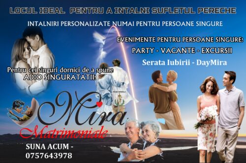 Matrimoniala Mira: Daca viata ta sentimentala a luat o intorsatura ciudata si crezi ca nu mai poti face fata…, daca clipele singuratatii te-au cuprins incat ziua de maine este doar o “alta zi”…, daca suferinta pierderii cuiva drag te afecteaza mai mult decat speranta unor clipe mai frumoase, atunci ai gasit locul potrivit in care poti face in mod placut toate schimbarile din viata ta… iar noi cu profesionalism de aproape 30 ani, suntem alaturi de tine. Indrazneste mai mult si vei vedea ca viata are si momentele ei frumoase. 0757643978 – nu sms