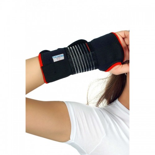 Orteza cu atela pentru articulatia mainii fabricata din neopren laminat dublu interior și exterior cu tricot. Neoprenul are perforații care reduc transpirația excesivă, fără a pierde temperatura corpului.