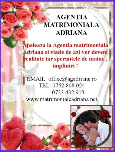 Daca esti exigent/a si nu vrei sa pierzi timpul, adreseaza-te cu incredere agentie Adriana !vei cunoaste persoana pe care tot timpul ai visat-o si dorit-o !Intermedieri matrimoniale pe plan local si in strainatate( ITALIA si FRANTA). Nu lasa sa treaca timpul fara ca sa incerci sansa care iti poate schimba destinul. Info Agentia matrimoniala Adriana tel : 0723.432.913 sau 0752.868.024