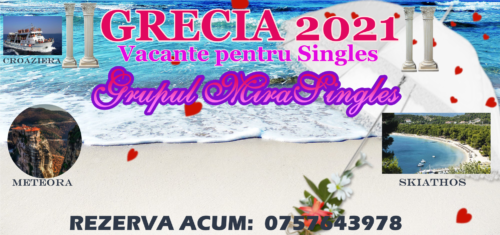 Esti singura? Ti-ar placea sa petreci o vacanta de vis unde razele soarelui si apa marii iti vor inunda zilele? Vacanta in Grecia – 03-12 Septembrie 2021 – o vacanta speciala pentru cei singles. Cu noi ai ocazia sa faci noi prietenii, sa cunosti alte persoane singure si in acelasi timp sa te bucuri de excursii si relax. Ultimele locuri! 0724982651 Nu SMS