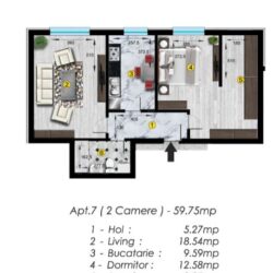 De vanzare apartament 2 camere finalizat cu o suprafata utila de 60 mp Locuinta este decomandata: dormitor matrimonial cu dressing 22 mp, bucatarie inchisa 9.59mp, ...